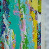 In diesem Werk offenbart sich, wie scheinbar beiläufige Farbabdrücke sich zu einem intensiven visuellen Erlebnis verdichten. Farbschichten in Türkis, Rosa, Schwarz, Violett, Gelb und Weiß tanzen in fließender Bewegung über die gedrehte Leinwand. Ein Teil des ursprünglichen Randes wurde sichtbar belassen – als Erinnerung an das, was vorher war.